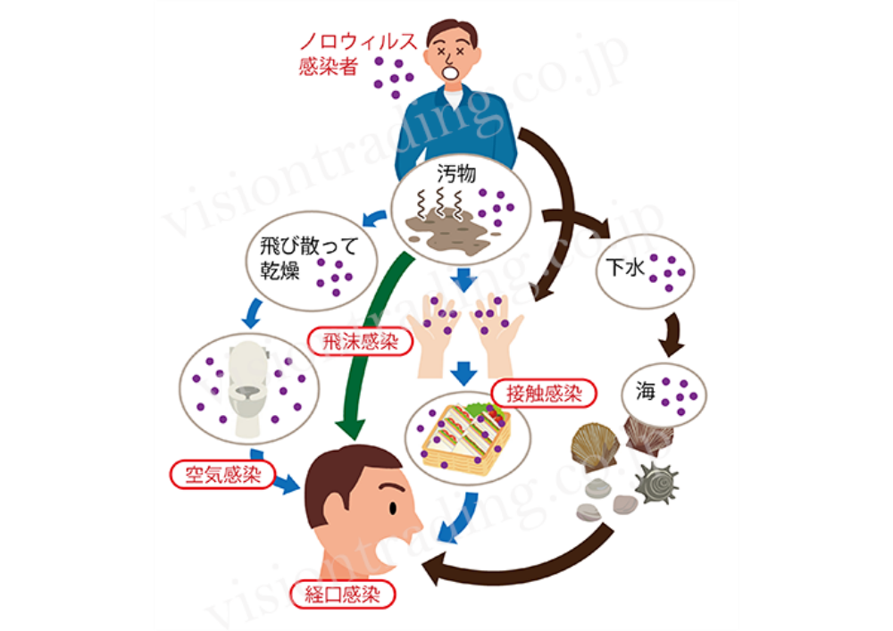 ノロウィルスには、「空気感染」「飛沫感染」「接触感染」「経口感染」という4つの感染経路があるとされています。