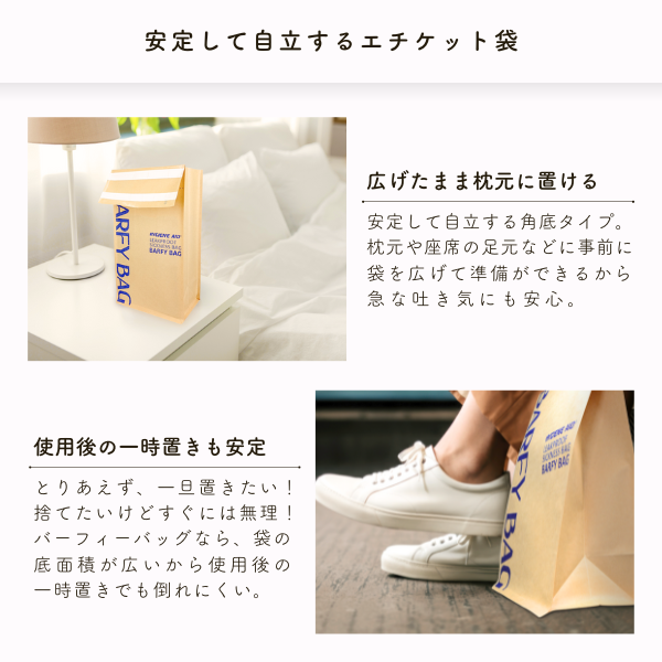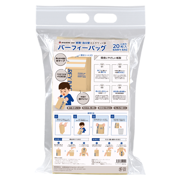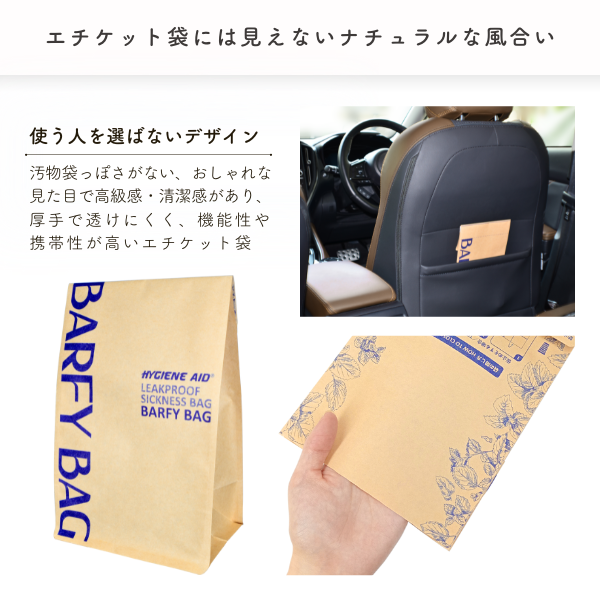 乗り物酔いなどに備え、車内のグローブボックスや座席裏ポケット等にかさ張らずに収納でき、いざというときにサッと取り出して使えます。