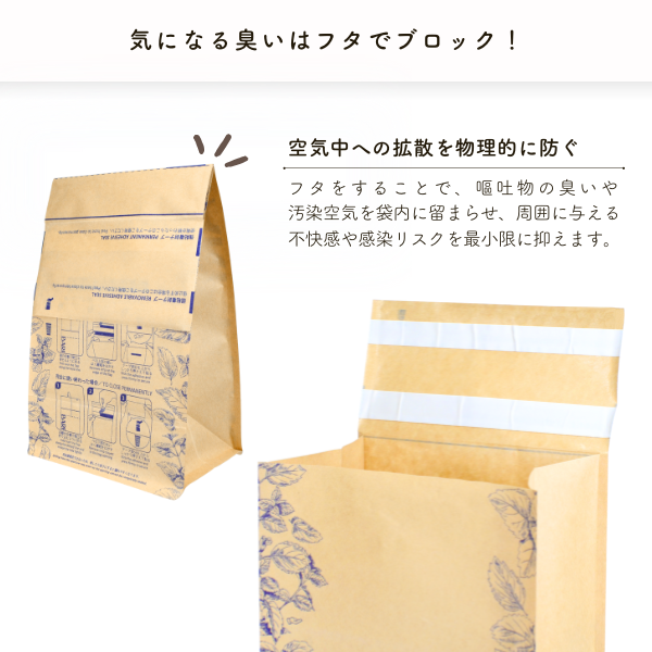 口蓋を閉めることで、嘔吐物のにおいや汚染空気を袋内に留まらせ、周囲に与える不快感や感染リスクを最小限に抑えます。
