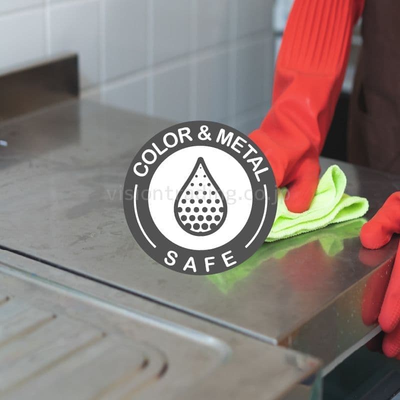 『洗浄水』には、”次亜塩素酸ナトリウム”のような漂白作用はありません。また、その成分に”ケイ素”を含むため、多くのアルカリ剤が苦手とするアルミニウム金属に対しても使用できます。