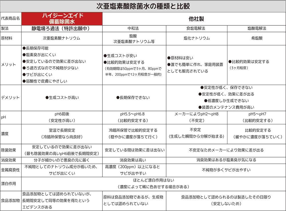 有機物との反応後は「水」になるため、「安心・安全」な「次亜塩素酸水」ですが、ハイジーンエイド『備蓄除菌水』/『防災除菌水5』は、これに加えて「長期安定」も提供する「高純度な次亜塩素酸水」です。